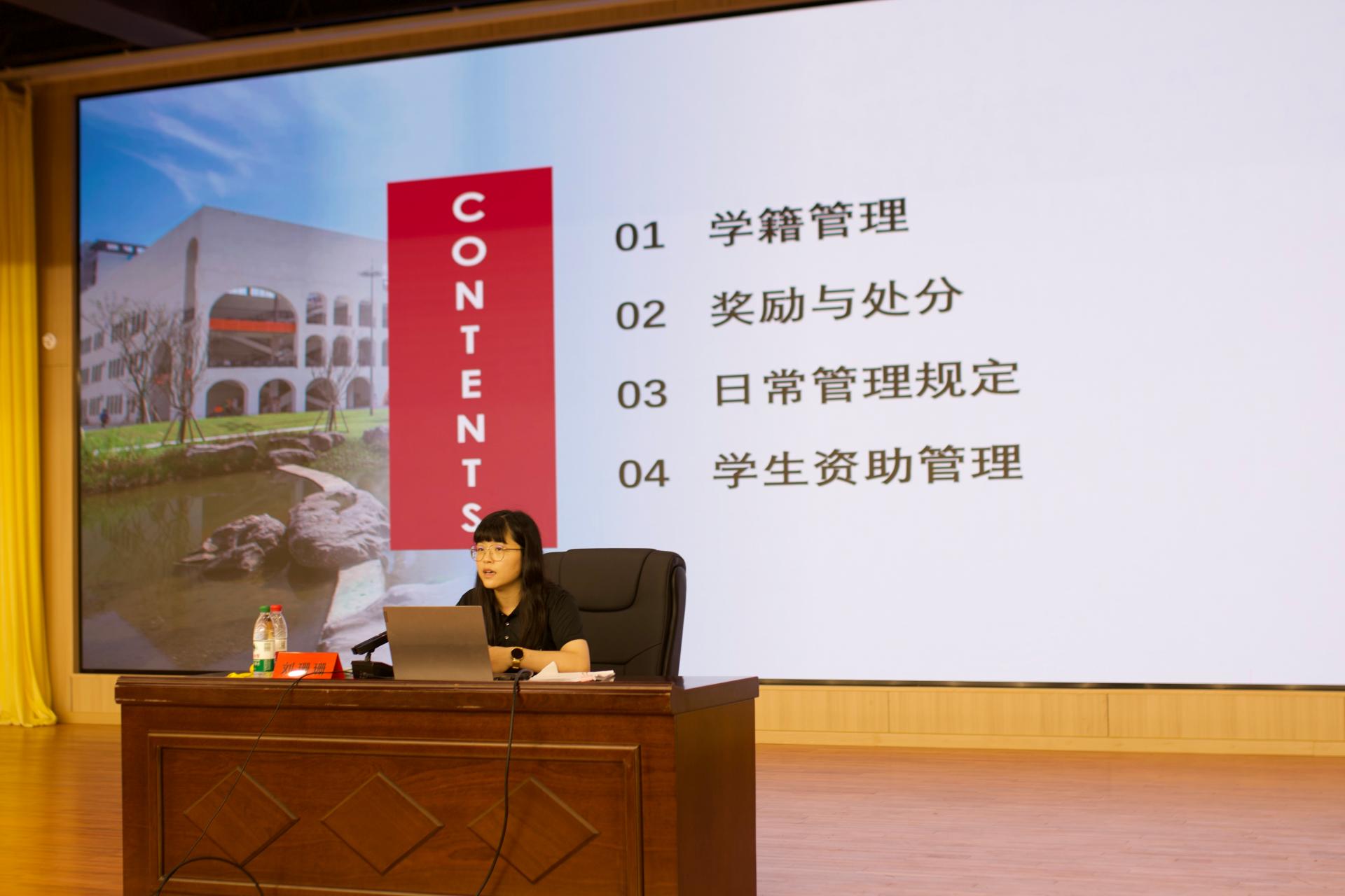 刘珊珊老师分别从学籍管理、奖励与处分、日常管理规定、学生资助管理等四个方面,向专升本的新生们详细讲解学生应遵守的基本行为规范,同时还包括课堂纪律、学术诚信、宿舍管理、公共设施使用等方面。并强调了学风建设与纪律性的重要性,详细解读了学院的课堂纪律、考试诚信及学术道德等规范,要求学生们在追求创意与自由的同时,不忘遵守规则,共同营造积极向上的学习环境。