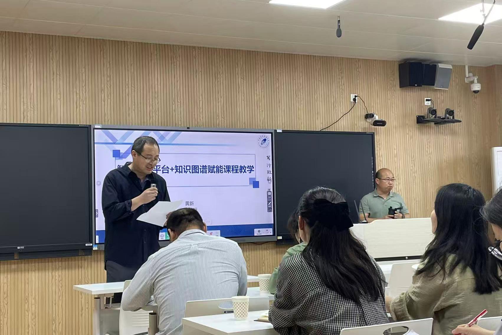 培训伊始,黄新教授深入浅出地介绍了智慧教学平台在现代教育中的重要性。他指出,通过智慧教学平台,教师不仅能够高效地建设和管理课程资源,还能实时跟踪学生的学习进度,实现个性化教学。黄教授以实际案例展示了如何利用平台功能创建互动式课程,激发学生主动参与课堂讨论,增强知识吸收效果。在知识图谱的讲解环节,黄新教授详细阐述了其构建方法及在教育领域的应用潜力。黄新教授还特别强调了利用知识图谱进行智能推荐,可以根据学生的学习历史和兴趣,推送相关学习资源,提升学习效率。同时,通过分析知识图谱中的数据,教师能够发现学生的薄弱环节,及时调整教学策略,实现精准教学。在互动讨论环节,教研室老师就实际教学中遇到的问题向黄新教授请教。团队成员表示,此次培训为他们打开了新思路,未来将尝试把智慧教学平台与知识图谱技术应用到自己的课程中,提升教学质量,为学生提供更优质的教育服务。