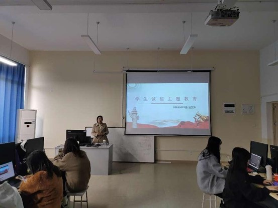 随着本学期学习的深入,各门课程考试陆续开展,为进一步加强考风考纪、建设优良学风教育,11月25日20655001班在E403教室召开了“学生诚信”主题的班会,班会由汪文萍老师进行主持,20655001班全体同学参加。