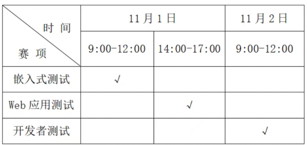 报名方式:大赛报名通道将于9 月 10 日 12:00 开启,届时请登录大赛官网(www.mooctest.org)报名,于 10 月 31 日 24:00 截止。个人赛由参赛者本人报名,鼓励选手报名参加多个赛项,大赛全程不收取任何费用。
