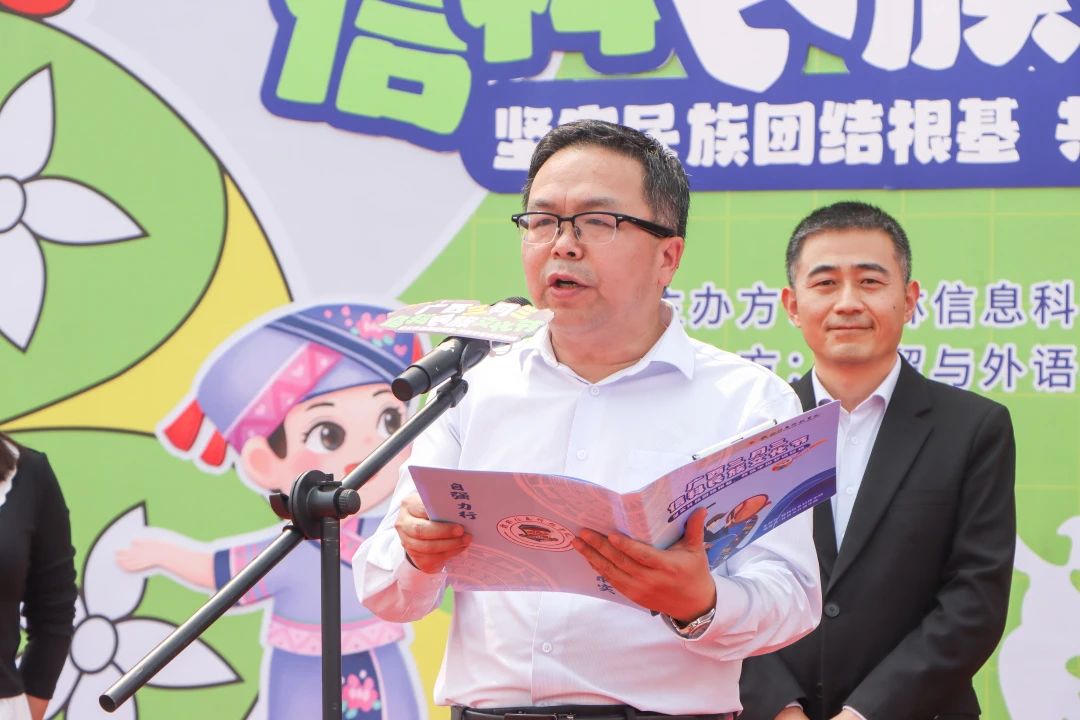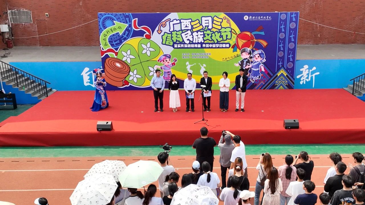 随着欢快的音乐响起,舞蹈《大地飞歌》拉开了活动的帷幕。舞者们身着色彩斑斓的民族服饰,翩翩起舞,展现了壮乡人民的热情与活力,瞬间点燃了现场气氛。3月27日下午14点,必赢优惠y272net操场热闹非凡,“潮玩三月三·青春壮乡行”主题活动在这里盛大开幕。校领导在开幕式上宣布活动正式开始。