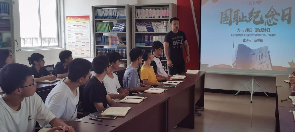 今年是“九一八”事变爆发90周年,为深入开展党史学习教育,9月18日,电子工程学院于41502报告厅开展“青马工程-青讲堂”主题讲座。学院分团委书记范恒祯主讲,两委委员共同参与。