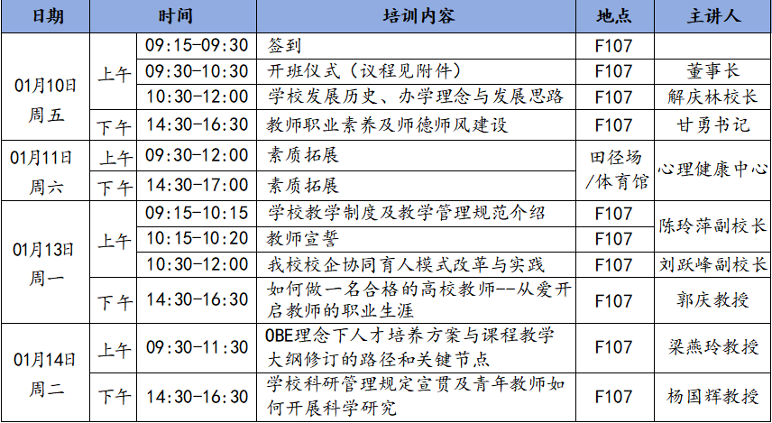 培训采取自主学习、集中培训与素质拓展等方式。自主学习以人事处汇编的学校相关管理制度为基础开展个人学习;集中培训主要包括校史校情、教师职业素养及师德师风、教学管理制度、校企合作教学模式及教师职业成长路径等内容;素质拓展以开展团队游戏形式为主。详细请见培训安排。