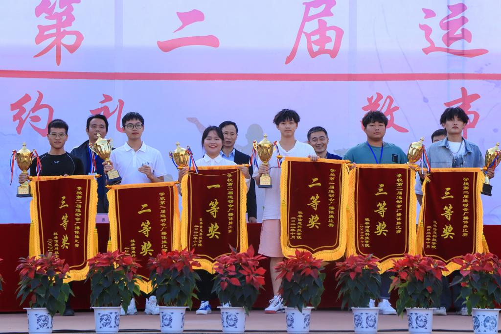 运动会期间,学校在田径场内设置了颁奖台,学校领导和相关单位负责人为获奖师生颁授奖牌并合影留念。