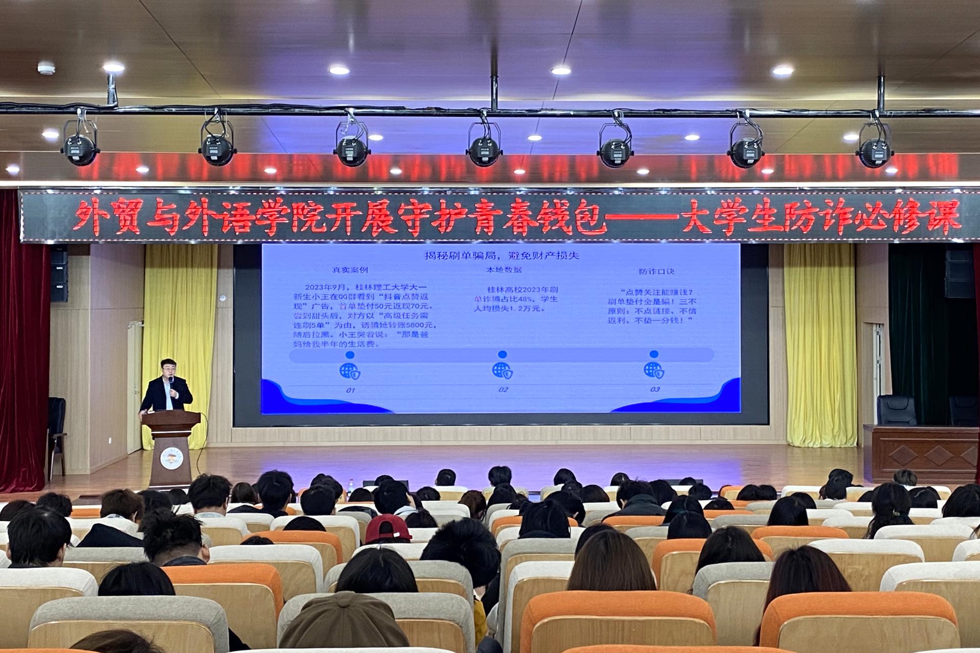 在数字化浪潮的冲击下,高校校园面临着严峻的诈骗挑战。为增强大学生防诈意识,提升防范能力,3 月 11 日至 17 日,外贸与外语学院举办了 “守护青春钱包 —— 大学生防诈必修课” 系列讲座。此次讲座由学院党总支书记李刚主讲,全体 24 级学生及辅导员参与。