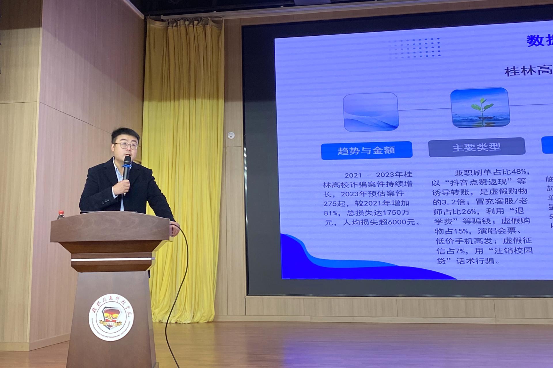 讲座开场,李刚书记以桂林的详实数据和典型案例为依据,敲响防诈警钟。近年来,诈骗案件数量上升,涉及兼职刷单、冒充客服等多种类型,其中兼职刷单诈骗占比高,给学生造成严重财产损失,让学生意识到防诈刻不容缓。接着,李刚书记剖析了大学生易受骗的原因并给出应对策略。谈及防诈技巧,李刚书记强调转账要“一停二打三见面”,即暂停操作、拨打保卫处电话、与当事人核实。同时,他提醒同学们做好信息防护,安装国家反诈中心 APP 并开启相关功能,牢记三个 “凡是” 保命法则,对可疑要求果断拒绝。通过深入了解校园诈骗现状、剖析受骗原因、识别诈骗套路、掌握防诈技巧以及明确被骗后的应对措施,学生们的防诈意识和能力得到了显著提升。