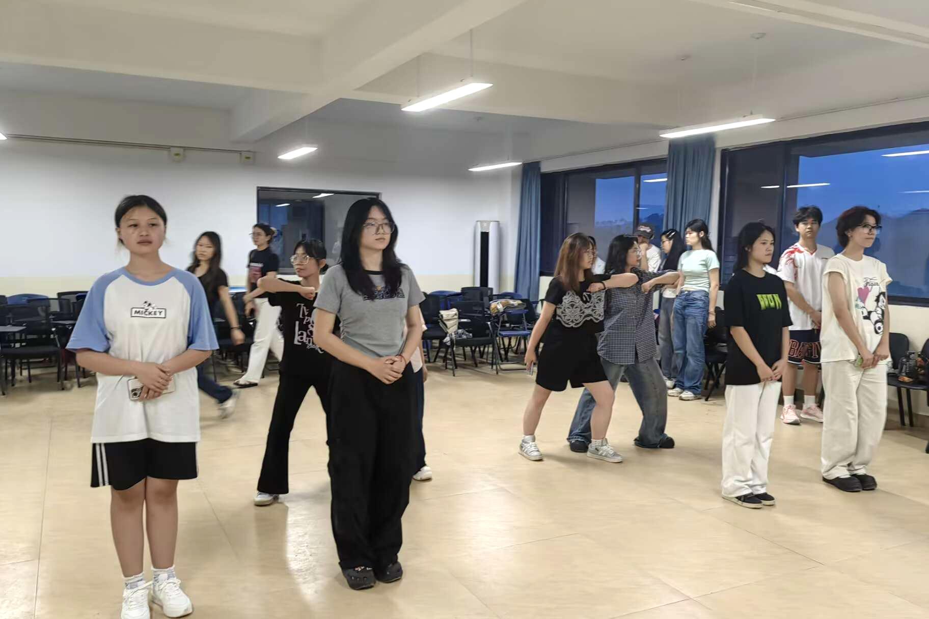 排练现场,同学们以精妙编排将比赛节目划分为五个篇章,以诗韵串联历史脉络,以舞姿诠释革命豪情。首章以雄浑激昂的“问苍茫大地,谁主沉浮?”破题,朗诵者目光如炬、声震全场,配合舞者舒展的肢体动作,瞬间勾勒出青年毛泽东对国家命运的深沉思索;“恰同学少年,风华正茂”的演绎中,学子们以青春洋溢的姿态,用饱含热忱的诵读与灵动舞步,重现革命青年挥斥方遒的壮志豪情。节目尾声,全体参演人员齐声高呼“数风流人物,还看今朝”,配合舞蹈造型,将对革命精神的传承与新时代青年的使命担当推向高潮,完成了一场跨越时空的精神对话与情感升华。