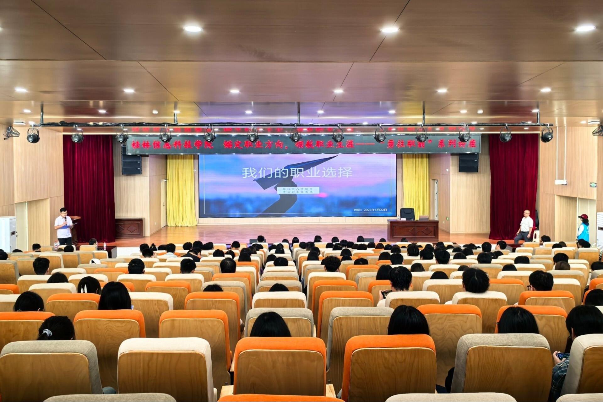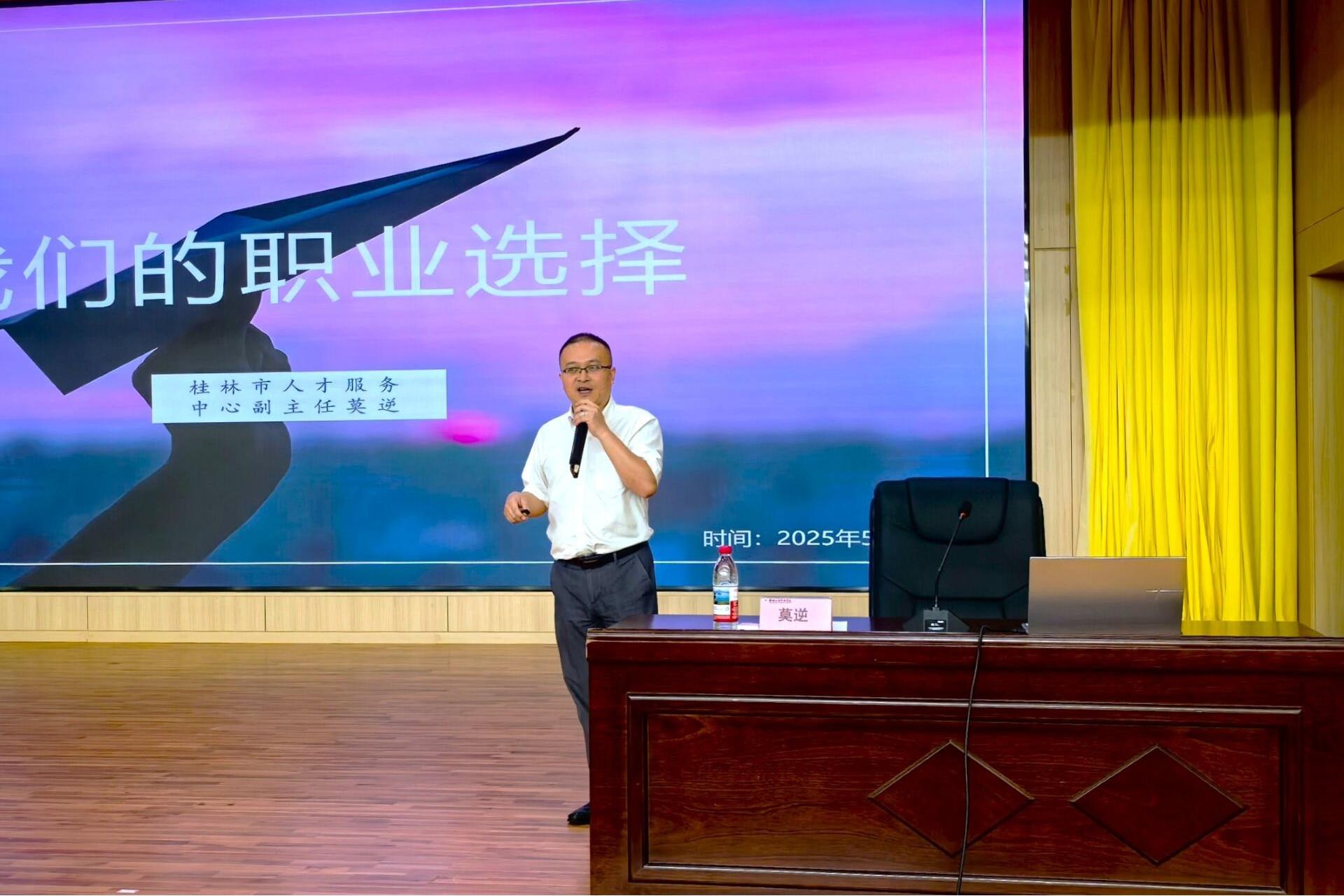 为进一步提升学生职业规划能力,5月28日下午,由学校就业指导服务中心主办、电子工程学院承办的“锚定职业方向,领航职业生涯”——“勇往职前”系列讲座在博文楼F107成功举办。桂林市人才服务中心副主任莫逆受邀担任主讲嘉宾,学校就业指导服务中心主任李晓健、各学院团委书记及300余名学生代表参加活动。