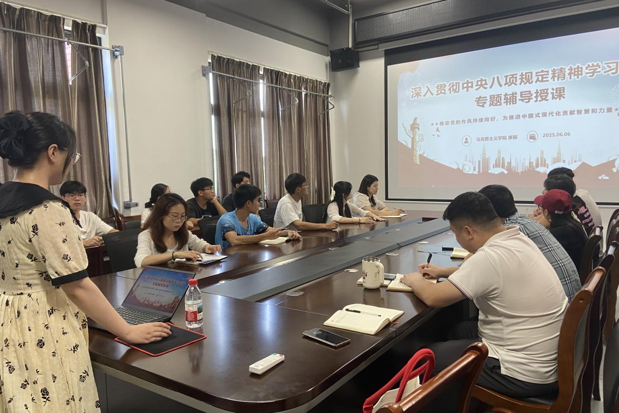 为深入贯彻中央八项规定精神学习教育,进一步加强党员干部作风建设,6月6日,体育与健康学院学生党支部在行健楼205会议室开展深入贯彻中央八项规定精神学习教育专题辅导授课。本次活动主讲人是马克思主义学院的廖丽老师。