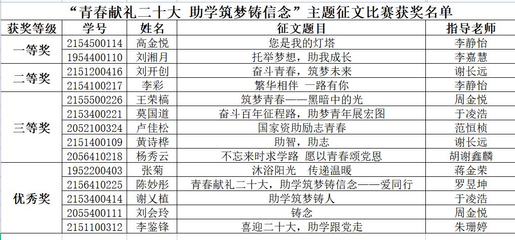 喜迎党的二十大,进一步推进学生资助政策宣传工作,必赢官网组织学生开展“青春献礼二十大,助学筑梦铸信念”资助主题征文比赛。各学院学生积极参加,经学院选拔,共收到推荐作品50篇,经校内评审,共评选出一等奖作品2篇,二等奖作品2篇,三等奖作品5篇,优秀奖作品5篇。